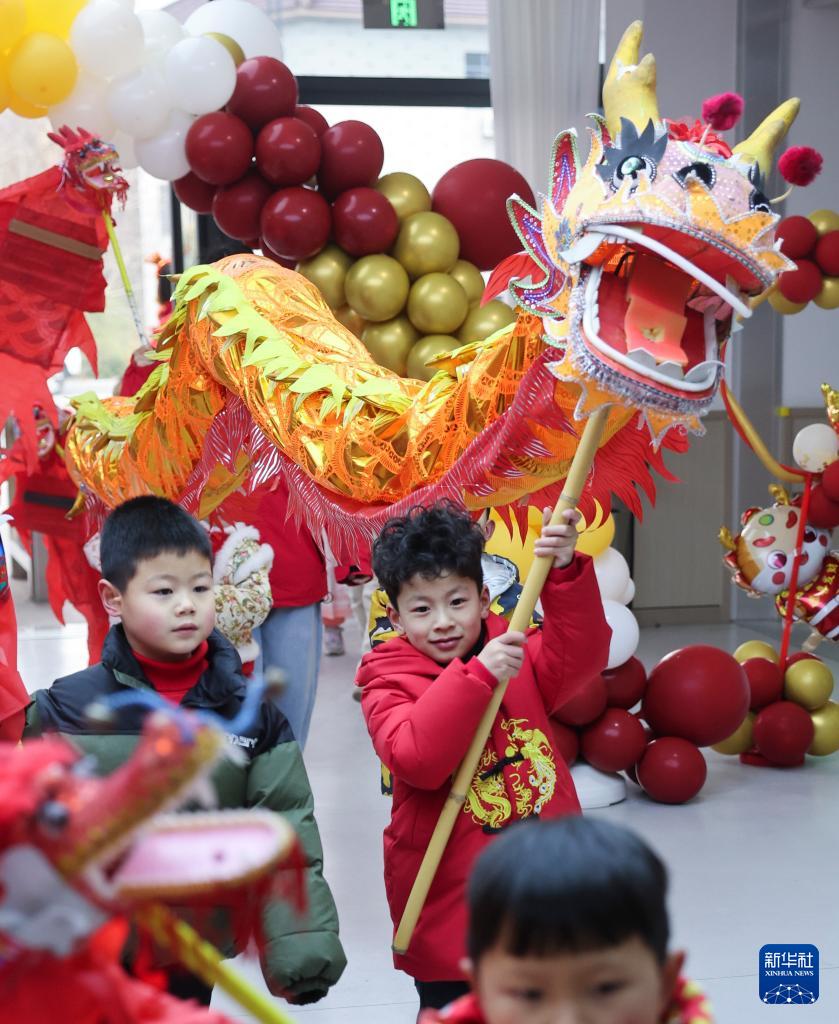 2月25日,李家巷镇中心幼儿园的孩子们在老师带领下体验舞龙。(新华社记者 徐昱 摄)