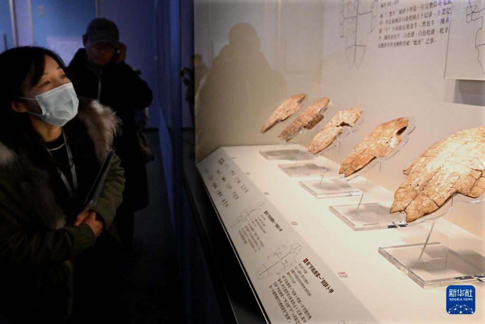 2月26日,参观者在河南安阳殷墟博物馆新馆内观看展出的刻辞卜甲。(新华社记者 李安 摄)