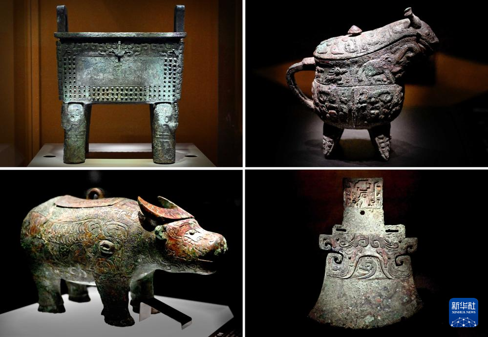 这是河南安阳殷墟博物馆新馆内展出的“司母辛”铜鼎(左上)、“亚长”铜觥(右上)、“亚长”牛尊(左下)、“亚长”铜钺(拼版照片,2月23日摄)。(新华社记者 李安 摄)