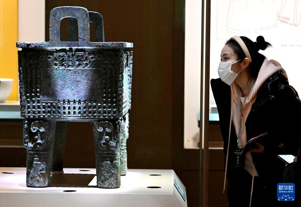 2月26日,参观者在河南安阳殷墟博物馆新馆内观看展品“司母辛”铜鼎。(新华社记者 李安 摄)