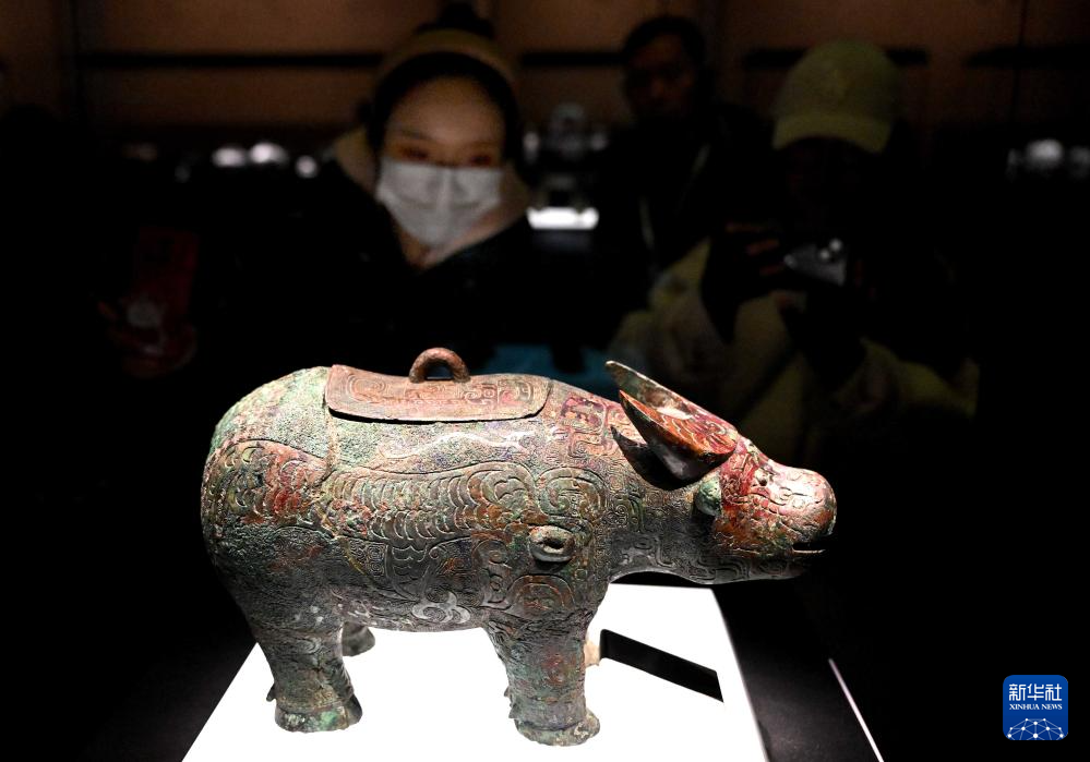 2月26日,参观者在河南安阳殷墟博物馆新馆内观看展品“亚长”牛尊。(新华社记者 李安 摄)