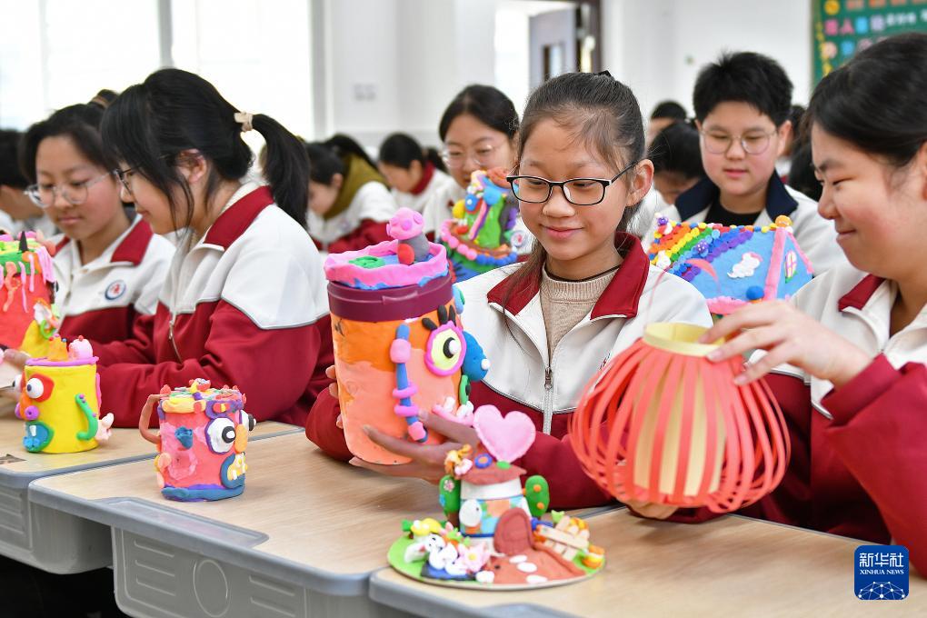2月26日,在山东省烟台市福山区芝阳山学校,学生在展示寒假期间制作的手工作品。(新华社发 孙文潭 摄)