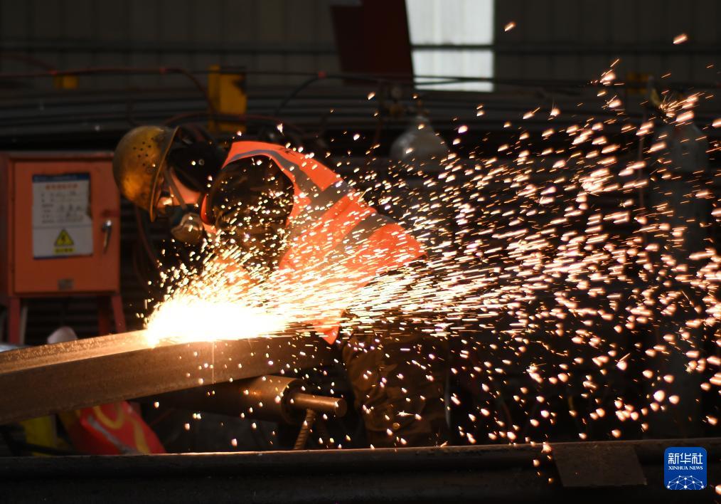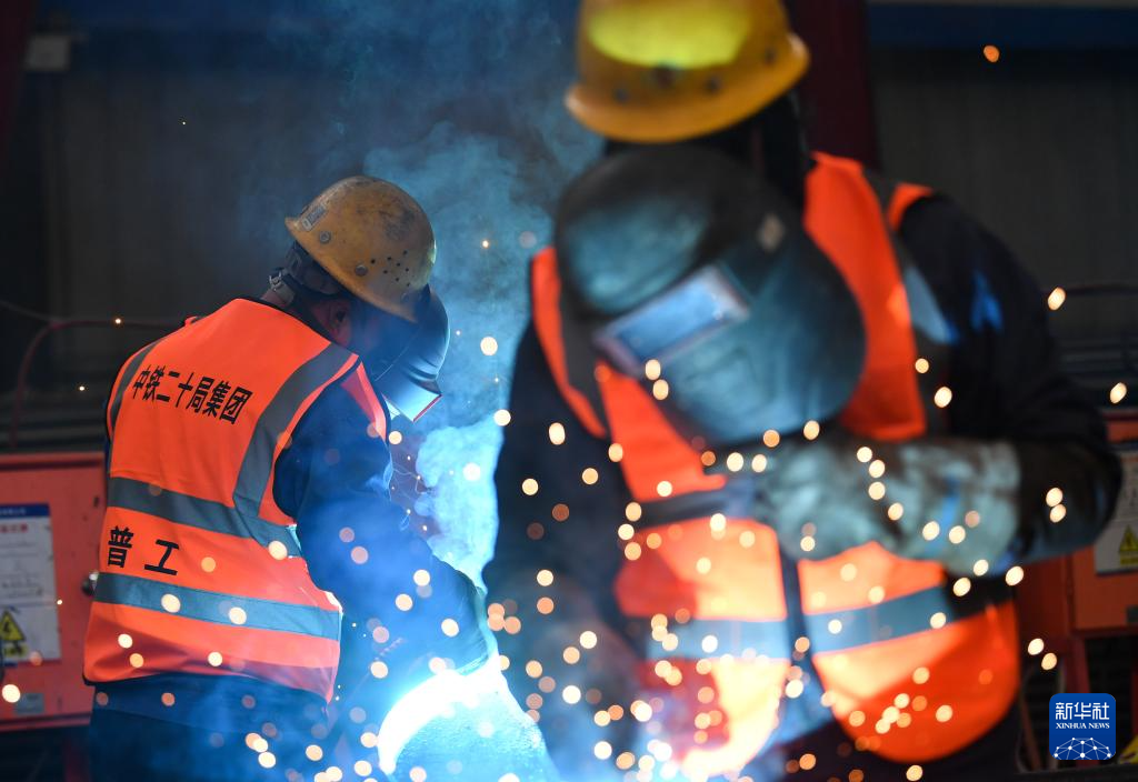 2月28日,中铁二十局工人在位于陕西省宝鸡市眉县的隧道钢构件加工厂施工。(新华社记者 张博文 摄)