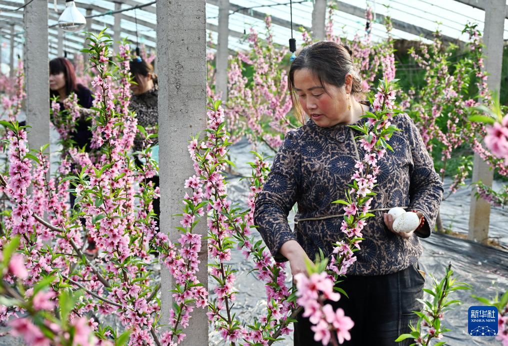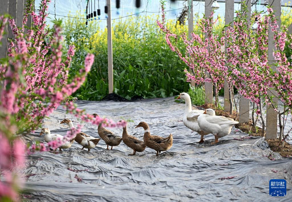 2月28日,平度市白沙河街道大孙戈庄村村民在油桃生态大棚内捡拾鹅蛋。(新华社记者 李紫恒 摄)