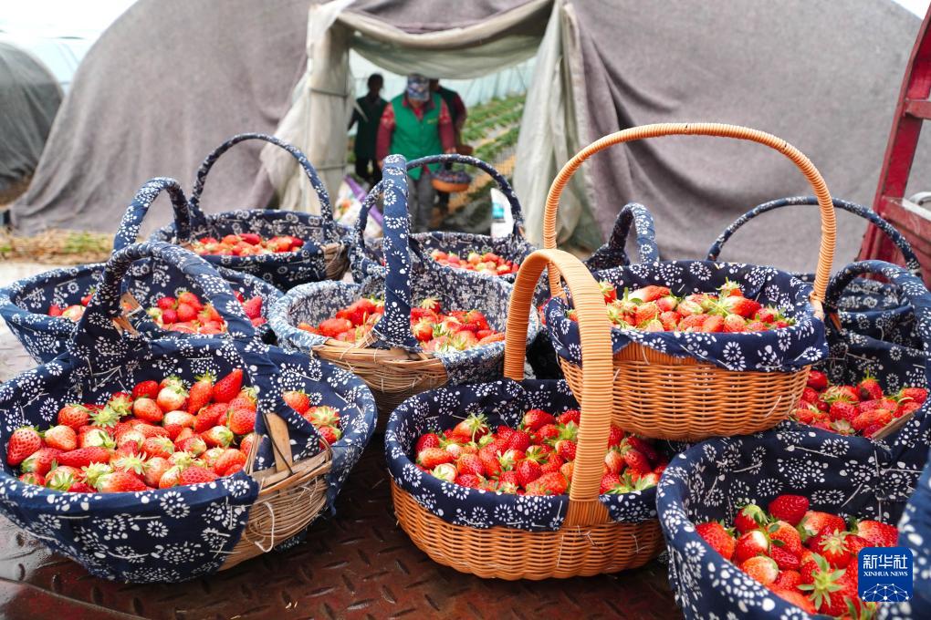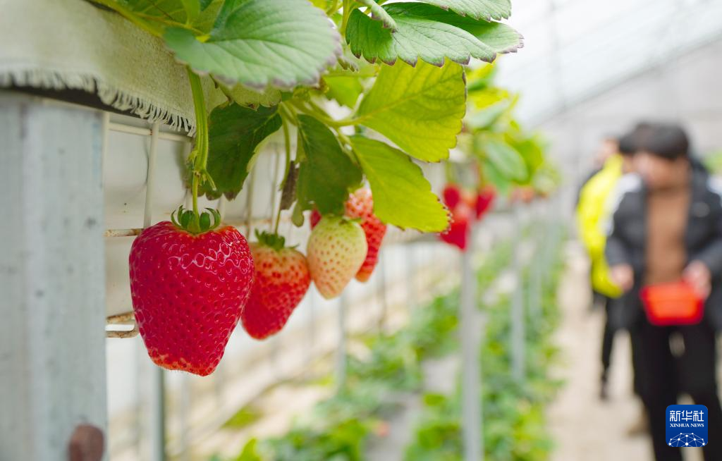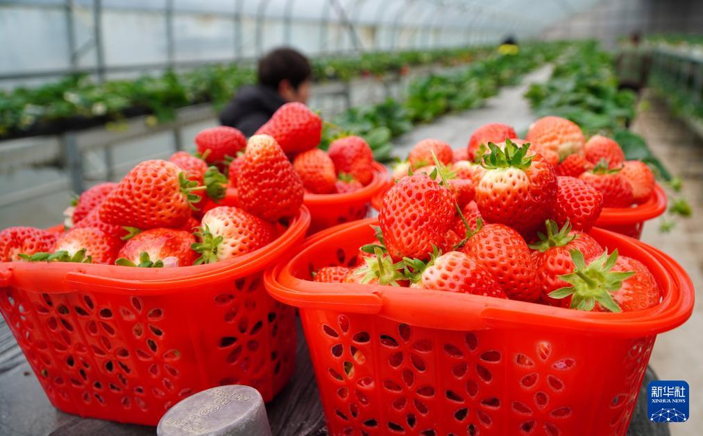 近日,山东省枣庄市的大棚草莓种植户忙着采摘成熟的草莓。近年来,枣庄发展大棚草莓种植产业,帮助农民拓宽增收渠道。