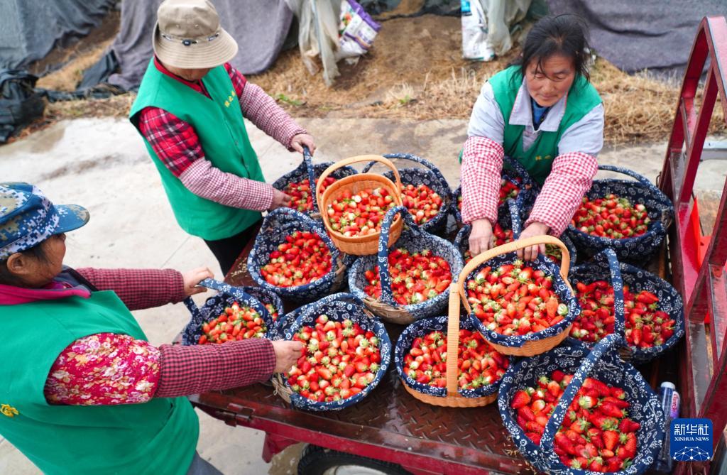 2月29日,在枣庄市薛城区常庄街道吴庄村一处大棚草莓种植园内,员工将刚采摘的草莓装车。(新华社记者 徐速绘 摄)