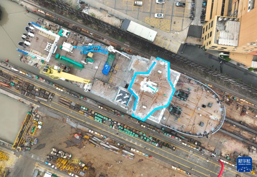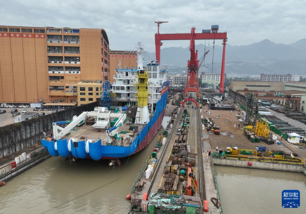 2月29日,海上风电多功能运维母船“M913-1”船在福州马尾的一处船坞准备下水(无人机照片)。(新华社记者 林善传 摄)