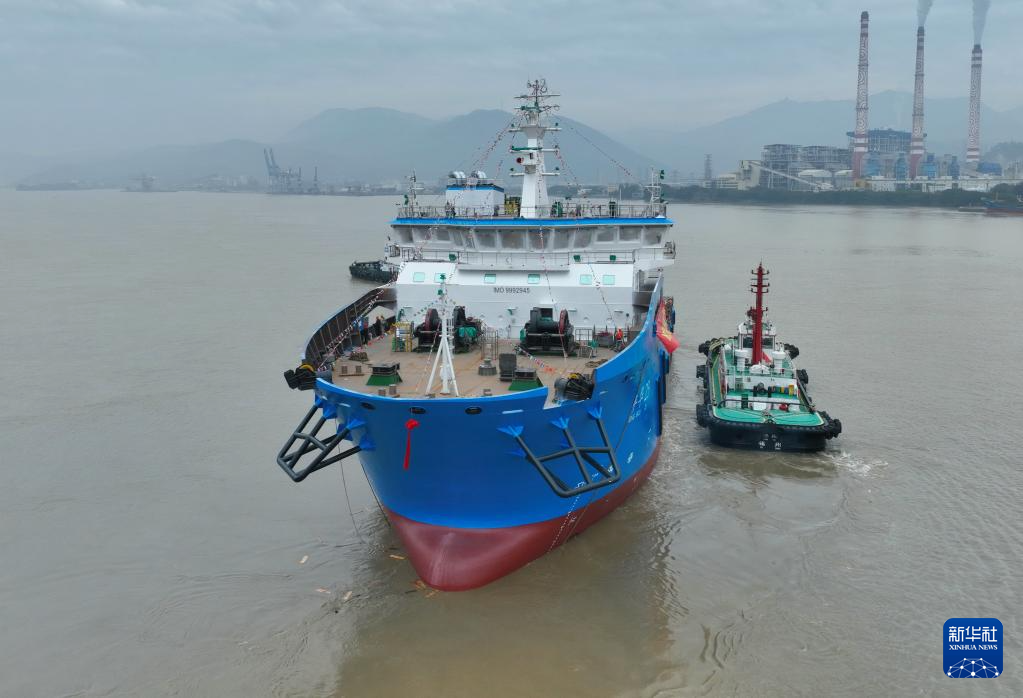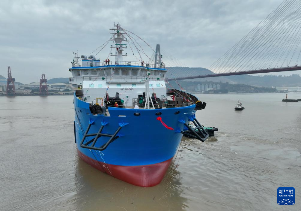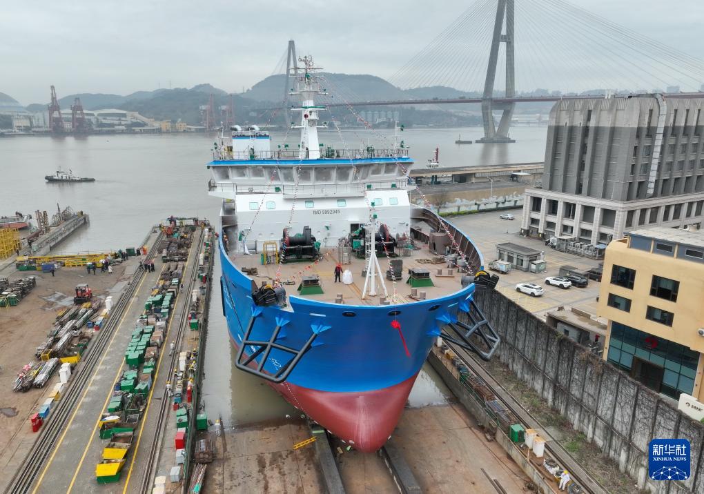 2月29日,海上风电多功能运维母船“M913-1”船顺利下水(无人机照片)。(新华社记者 林善传 摄)