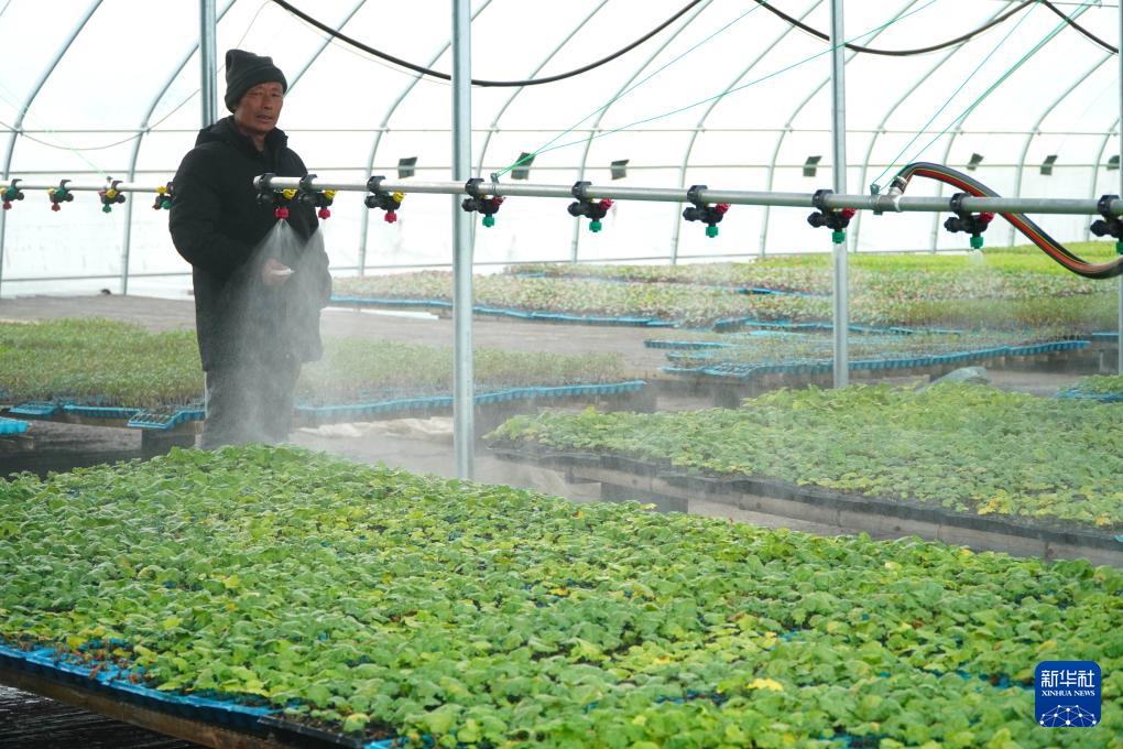 2月29日,工作人员在山东省枣庄市峄城区吴林街道一处种苗培育大棚内为幼苗浇水。(新华社记者 徐速绘 摄)