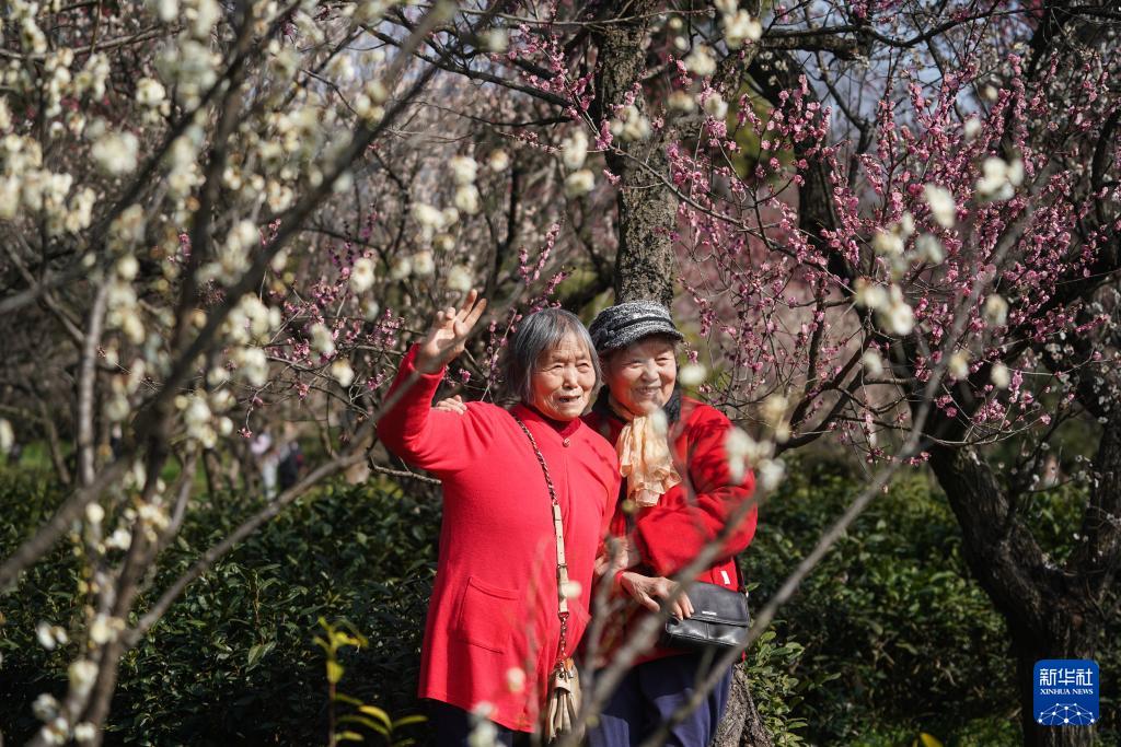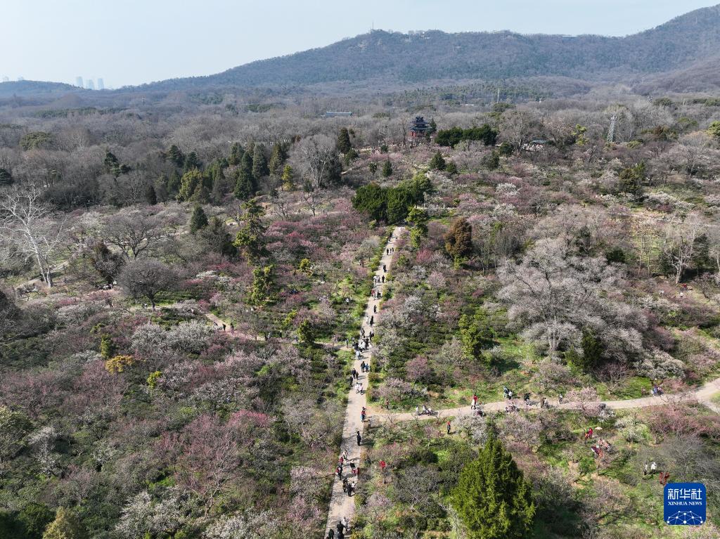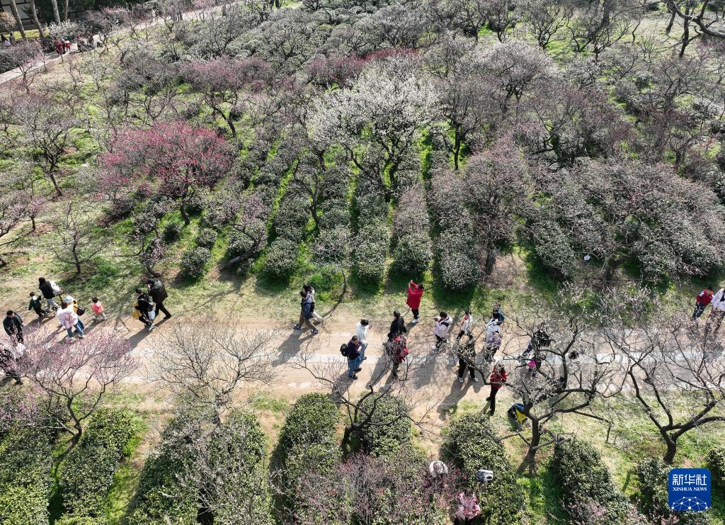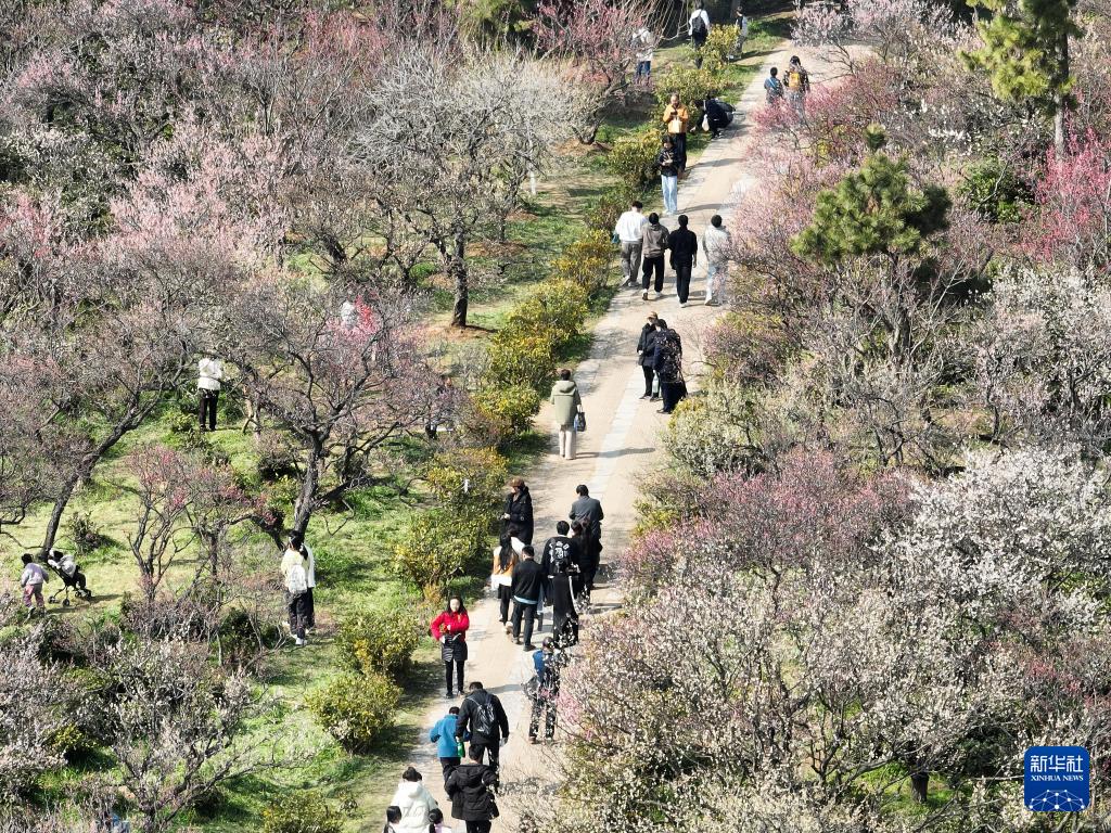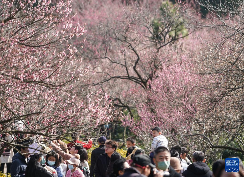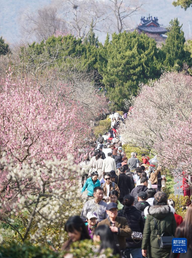 眼下,江苏南京梅花山上各色梅花竞相绽放,吸引游人前来赏花拍照,享受美好春日时光。