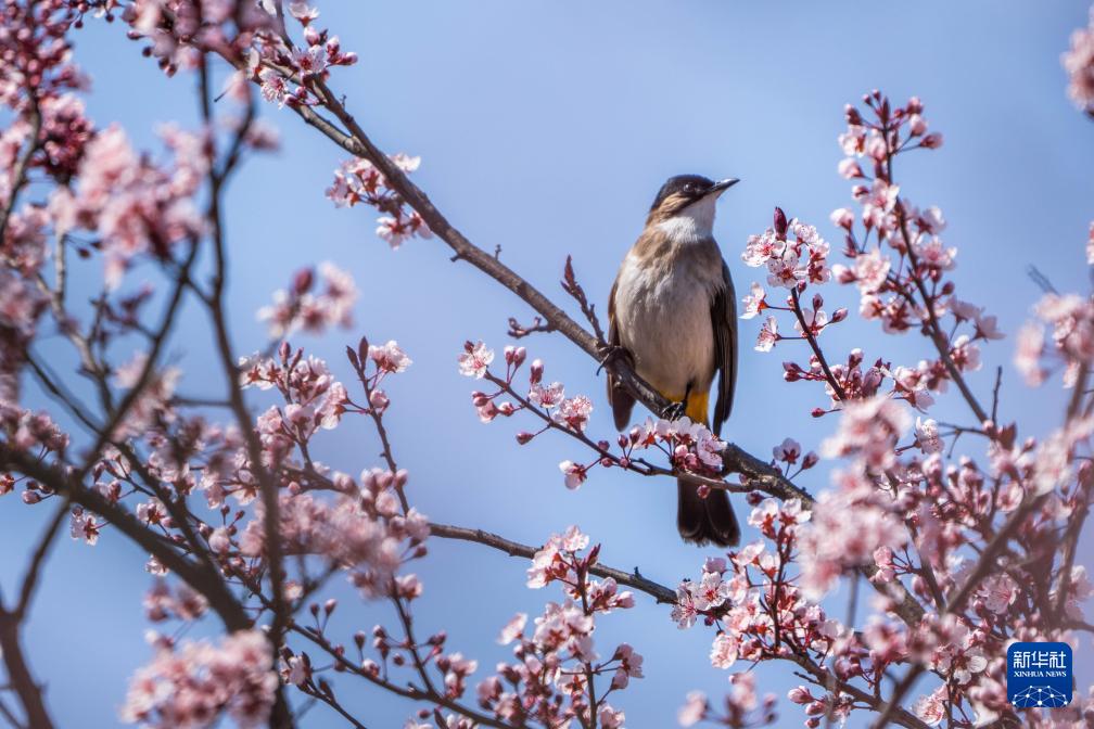 3月3日,在贵州省毕节市碧阳湖畔,一只小鸟停在花间枝头。(新华社发 罗大富 摄)