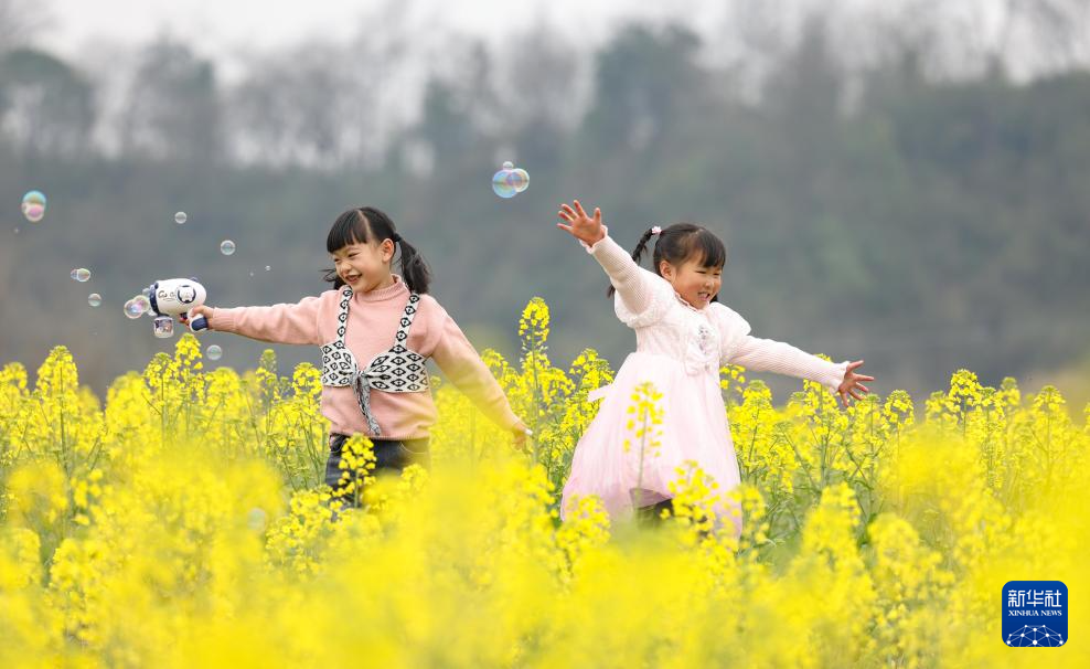 3月3日,小朋友在贵州省铜仁市玉屏侗族自治县新店镇狸狮坪村油菜花田游玩。(新华社发 胡攀学 摄)
