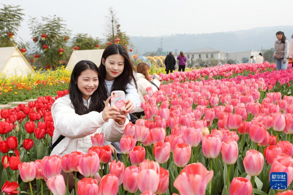 3月3日,在重庆市永川区南大街街道十里荷香景区,游客在郁金香花海中拍照。(新华社发 陈仕川 摄)