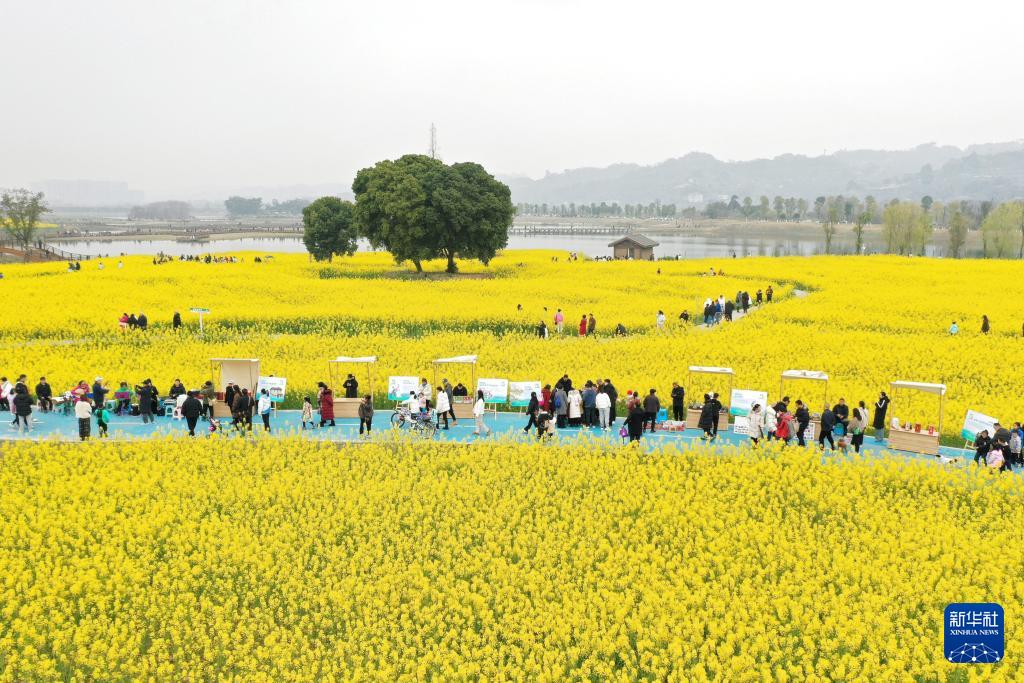 3月3日,游客在四川省眉山市彭山区五湖四海湿地公园油菜花田游玩(无人机照片)。(新华社发 姚永亮 摄)