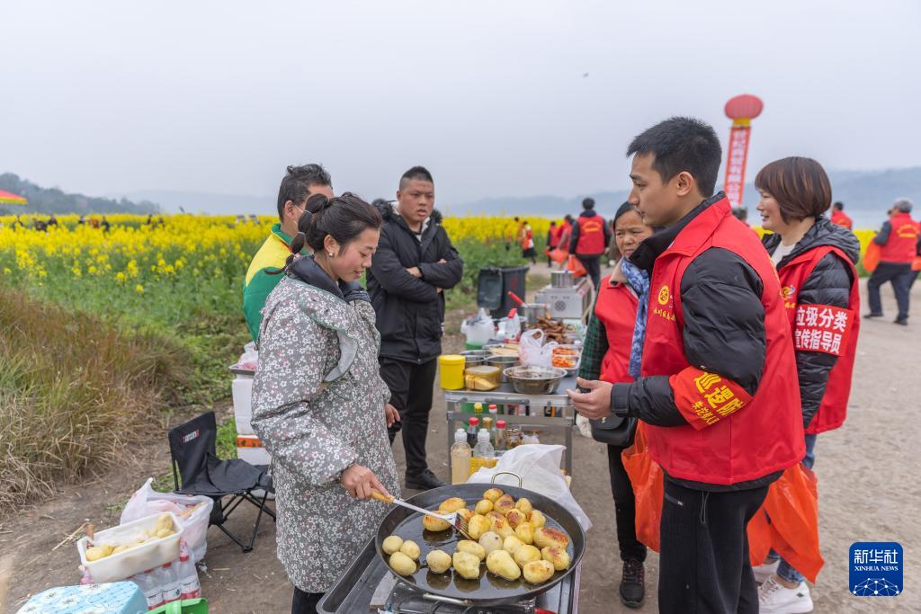 3月4日,川渝“一抹志愿红”联合志愿服务队成员向江边的临时经营商贩宣讲保护环境知识。(新华社记者 黄伟 摄)