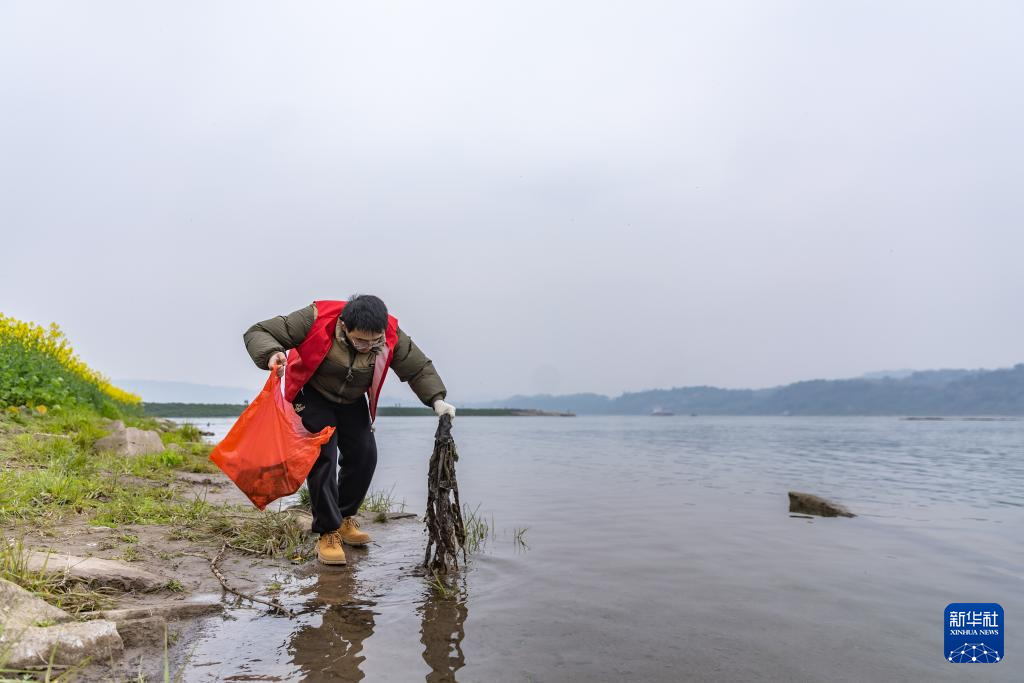 3月4日,川渝“一抹志愿红”联合志愿服务队在清理江边的垃圾。(新华社记者 黄伟 摄)