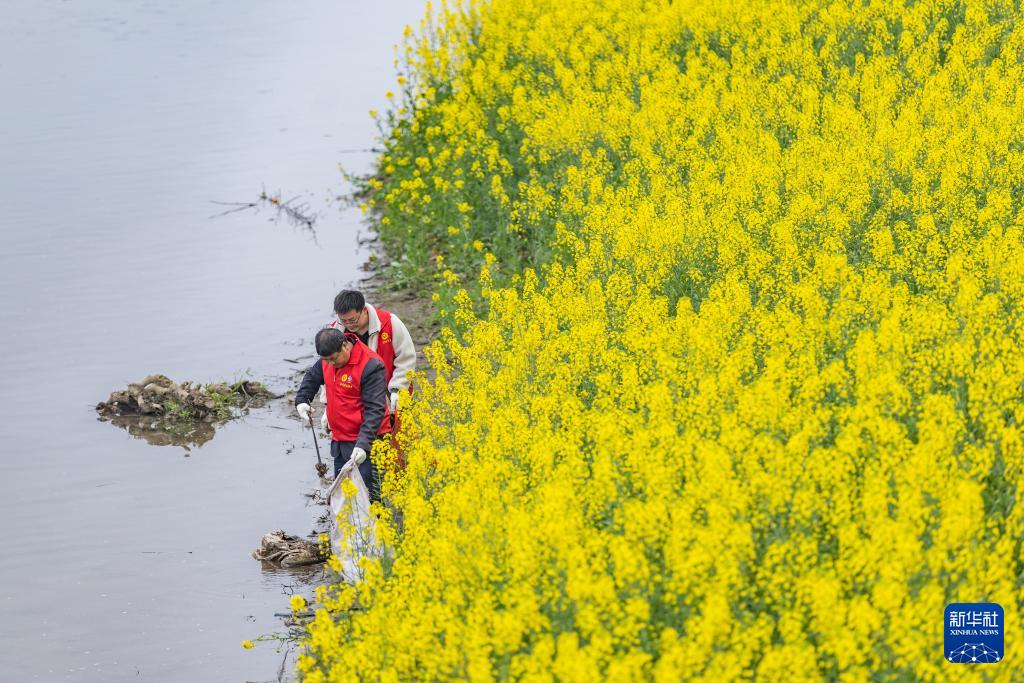 3月4日,川渝“一抹志愿红”联合志愿服务队成员在清理江边的垃圾。(新华社记者 黄伟 摄)