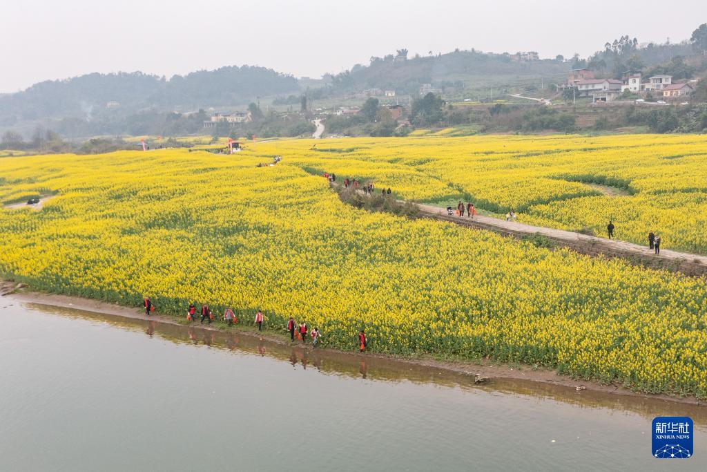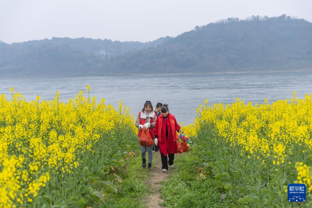 3月4日,川渝“一抹志愿红”联合志愿服务队成员清理完江边的垃圾后返回。(新华社记者 黄伟 摄)