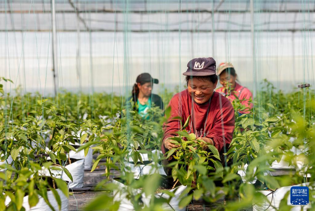 3月4日,村民在罗甸县逢亭镇粤港澳大湾区蔬菜保供基地管护辣椒。(新华社发 范晖 摄)