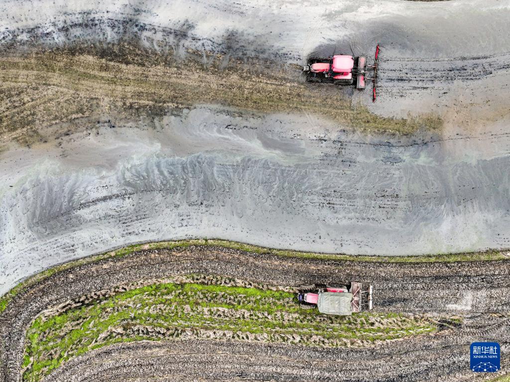 3月5日,在重庆市梁平区屏锦镇万年社区,农民驾驶拖拉机翻耕田地(无人机照片)。(新华社记者 唐奕 摄)