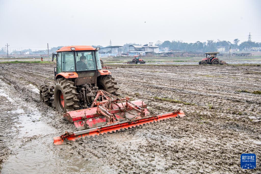 3月5日,在重庆市梁平区屏锦镇万年社区,农民驾驶拖拉机翻耕田地。(新华社记者 唐奕 摄)