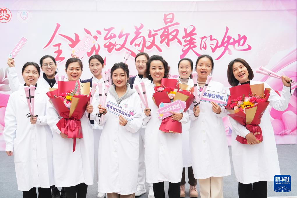 3月5日,重庆市北碚区妇联开展“全城致敬最美的她”主题活动,重庆市北碚区妇幼保健院医护人员手捧志愿者赠送的鲜花合影留念。(新华社发 秦廷富 摄)