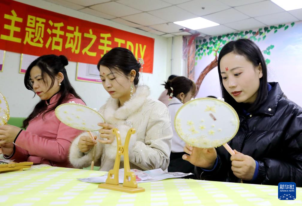 3月5日,在河南省济源市济源高新技术产业开发区科技园,女职工参加团扇手工制作活动。(新华社发 段二平 摄)