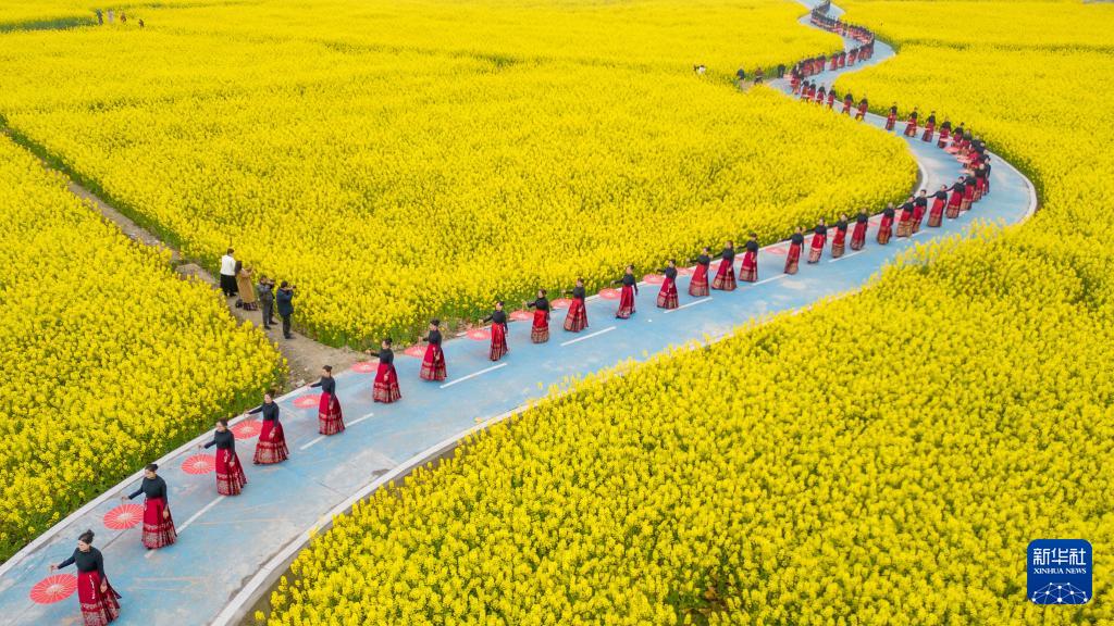 3月4日,在四川省眉山市彭山区五湖四海湿地公园油菜花田,来自眉山市老年大学的百余名汉服爱好者走秀表演(无人机照片)。(新华社发 翁光建 摄)