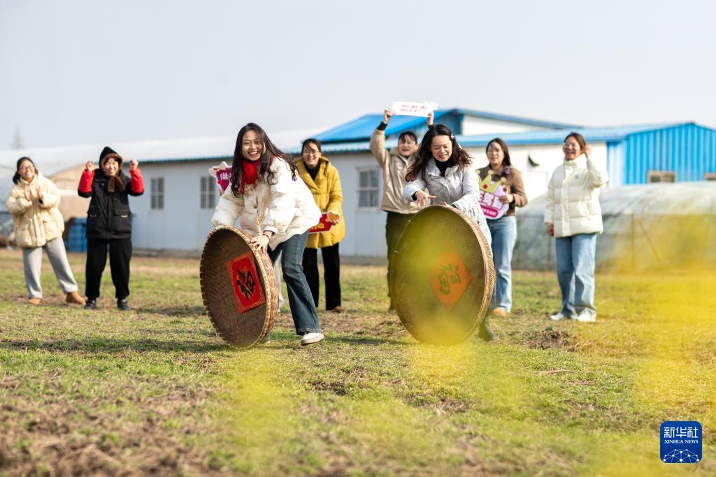 3月6日,在江苏省兴化市林湖乡,妇女们参加滚竹匾趣味比赛。(新华社发 周社根 摄)