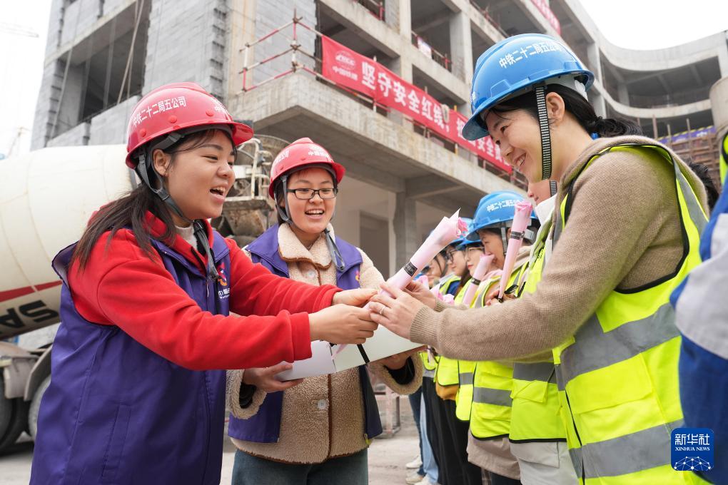 3月5日,重庆市北碚区妇联开展“全城致敬最美的她”主题活动。北碚区妇联的巾帼志愿者为中铁二十二局五公司的妇女职工献花、送上祝福。(新华社发 秦廷富 摄)