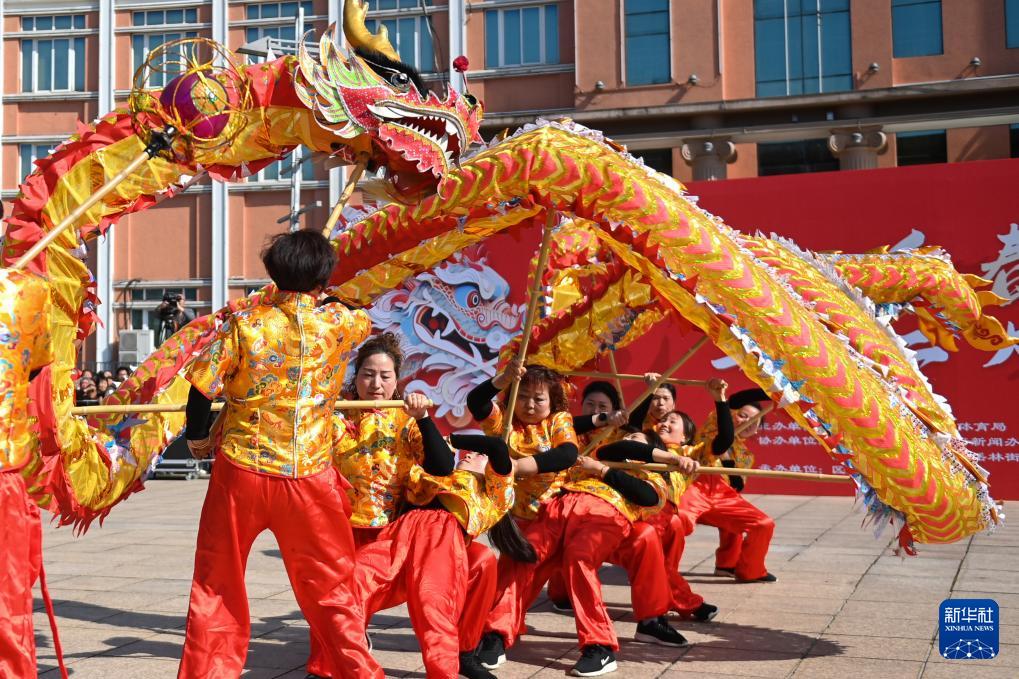 3月10日,一支女子舞龙队在奉化区岳林广场进行表演。(新华社记者 黄宗治 摄)