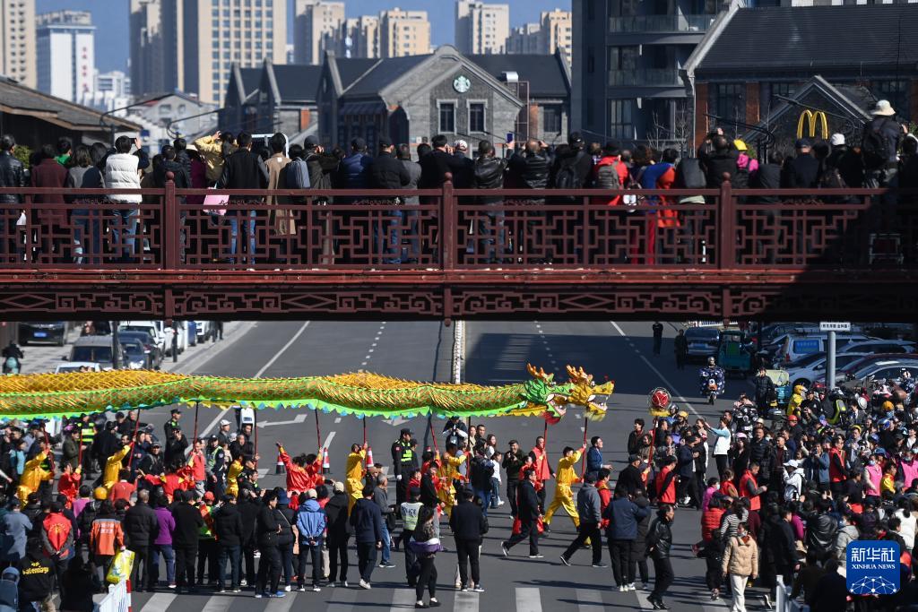 3月10日,奉化布龙在城市街区巡游。(新华社记者 黄宗治 摄)