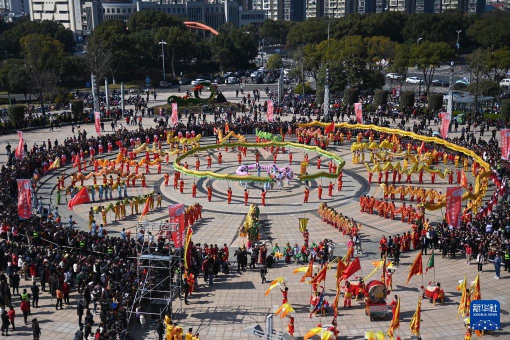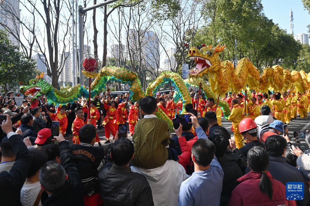 3月10日,奉化布龙队伍在岳林广场表演。(新华社记者 黄宗治 摄)