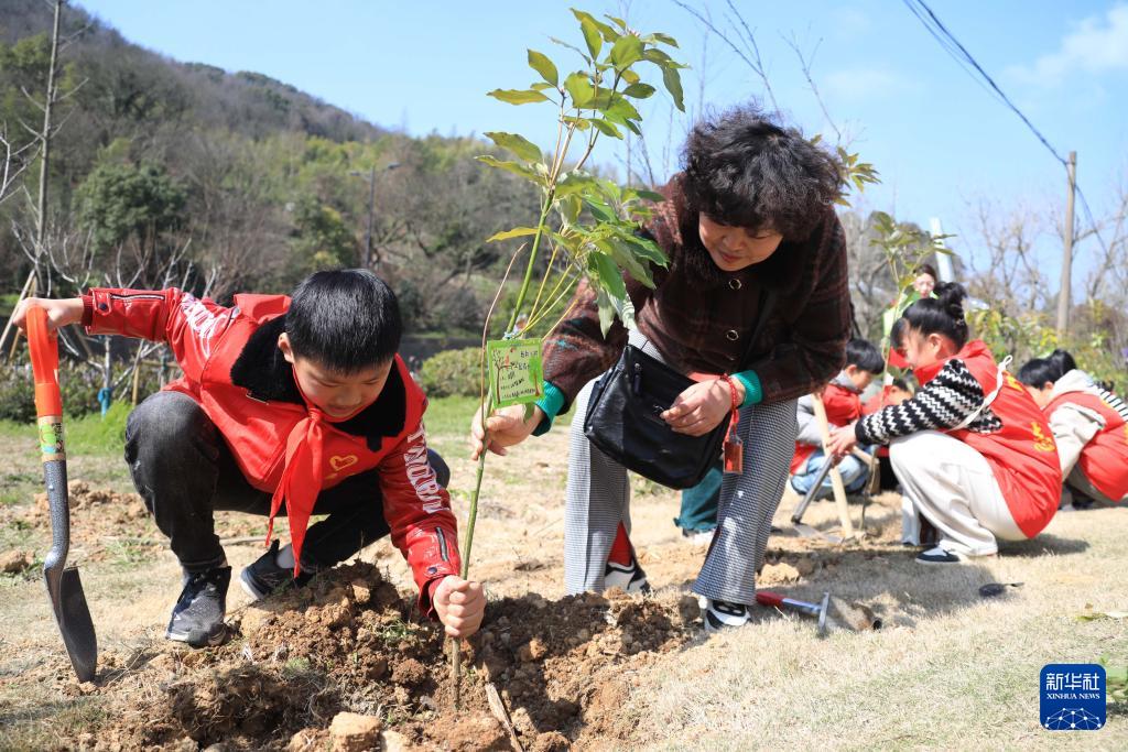 3月10日,在浙江省舟山市定海区,小朋友和家长参加义务植树活动。(新华社发 陈永建 摄)