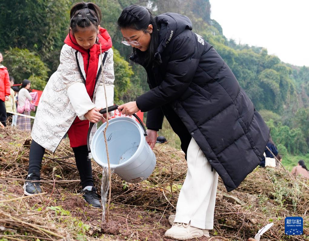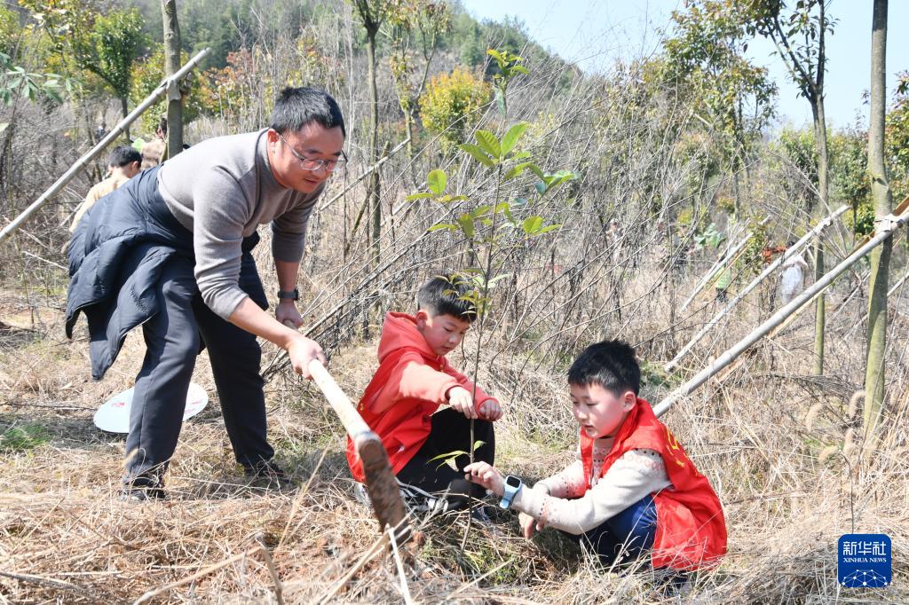 3月10日,在重庆市北碚区马鞍溪湿地公园,家长带着孩子参加义务植树活动。(新华社发 秦廷富 摄)