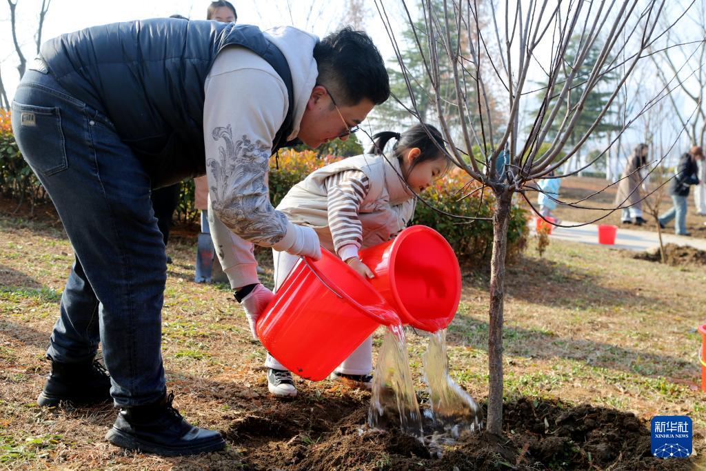 3月9日,家长和小朋友在山东省临沂市兰山区祊河北岸参加植树活动。(新华社发 孙磊 摄)
