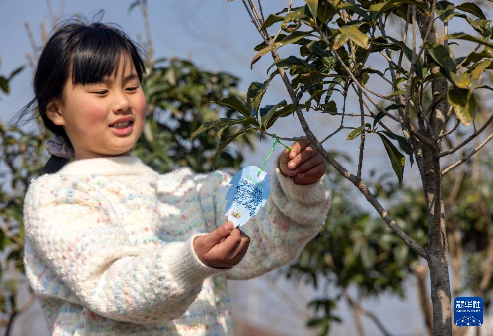 3月10日,在江苏省泰州市海陵区苏陈镇嘉宝农场,小朋友在植树后给树苗挂上“爱心卡”。(新华社发 汤德宏 摄)