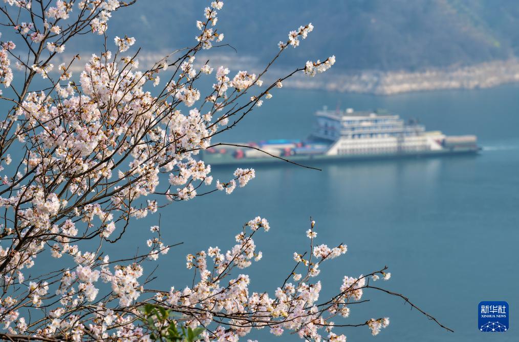 春到三峡,山花盛开,江水碧绿,船舶航行江面,构成一幅幅美丽的图画。