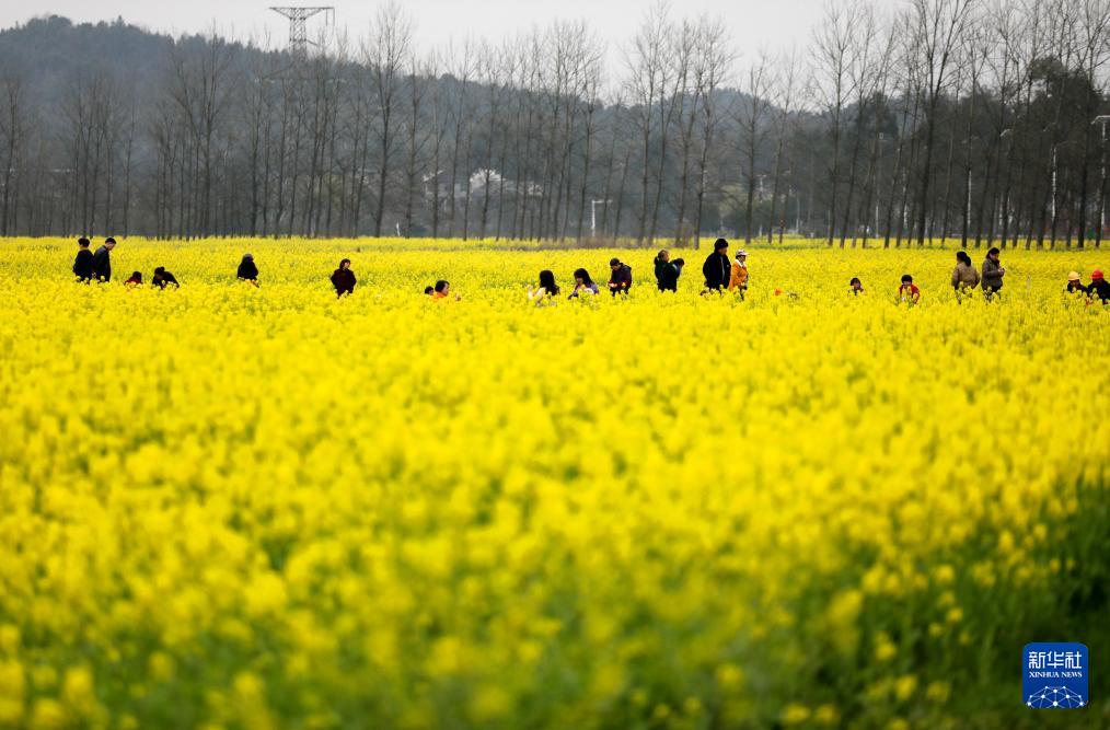 3月13日,游客在湖南省资兴市蓼江镇油菜花海赏景游玩。(新华社发 李科 摄)