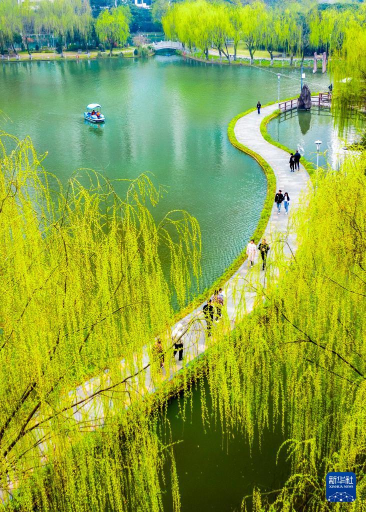 3月13日,市民在浙江省温州市马鞍池公园踏青(无人机照片)。(新华社发 刘吉利 摄)