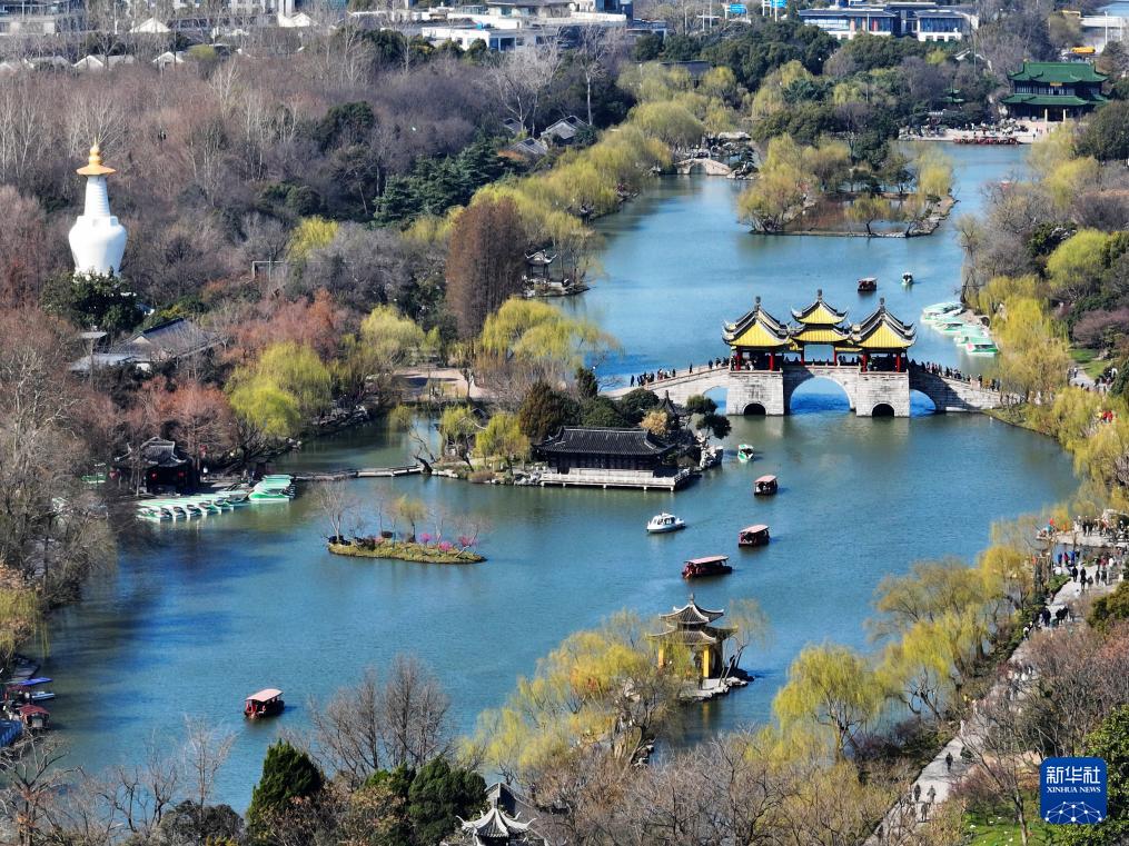 3月13日拍摄的江苏扬州瘦西湖风景区春色(无人机照片)。(新华社发 孟德龙 摄)