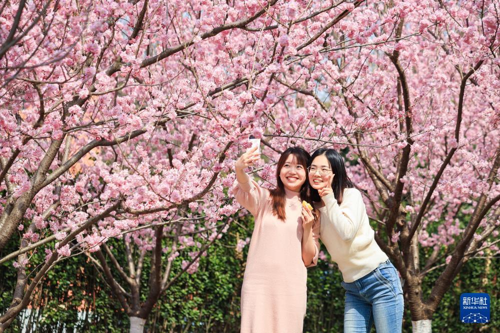 3月13日,游人在南京中山植物园赏樱拍照。(新华社发 苏阳 摄)