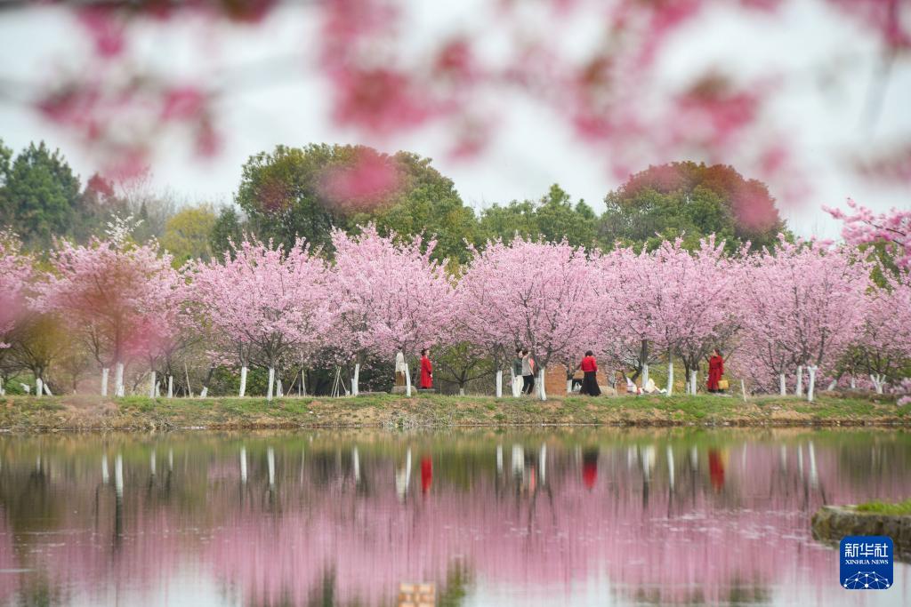 3月13日,游人在浙江省兰溪市诸葛镇“智慧谜宫”樱花园游玩。(新华社发 时宽兵 摄)