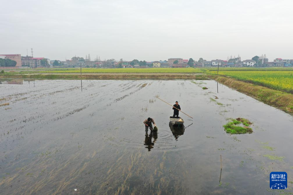 3月13日,养殖户在南县浪拔湖高效优质大虾英雄队示范基地采收水草准备出售(无人机照片)。(新华社记者 薛宇舸 摄)