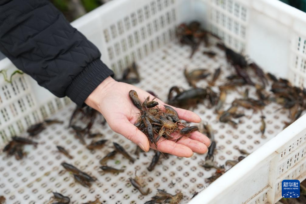3月13日,养殖户在南县浪拔湖高效优质大虾英雄队示范基地查看小龙虾虾苗长势。(新华社记者 薛宇舸 摄)