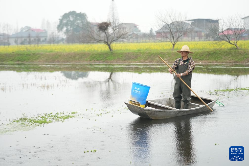 3月13日,养殖户在南县浪拔湖高效优质大虾英雄队示范基地驾船给小龙虾喂食。(新华社记者 薛宇舸 摄)