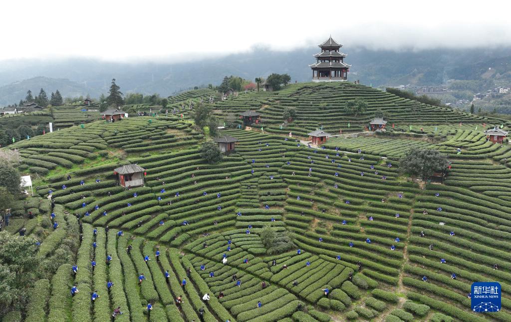 3月14日,柳州市三江侗族自治县八江镇布央村的村民在采茶(无人机照片)。(新华社记者 黄孝邦 摄)