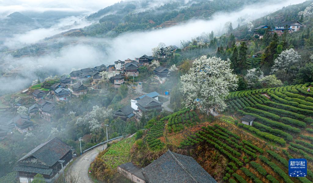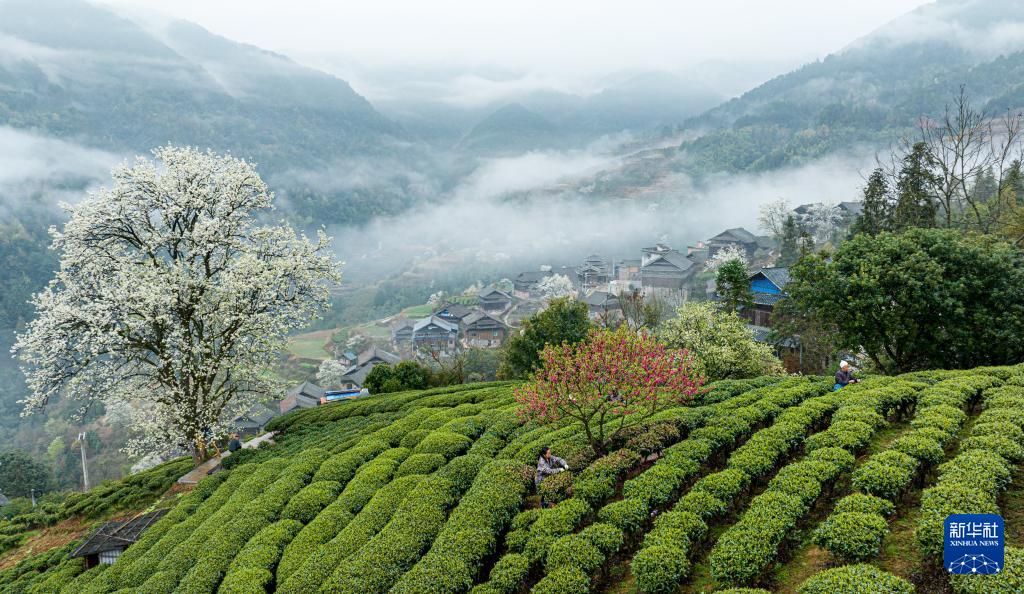 春到茶乡,三江县的村寨、山花与茶园构成美丽的田园图画。