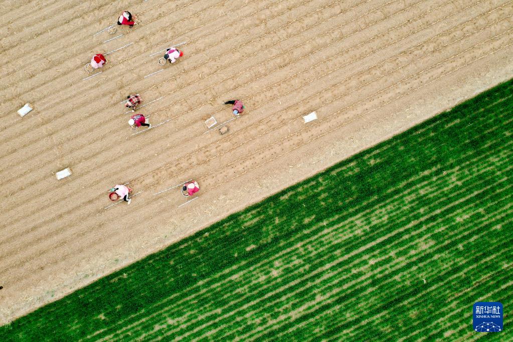 3月17日,河南省焦作市温县黄庄镇南韩村农民在田间种植铁棍山药(无人机照片)。(新华社发 徐宏星 摄)