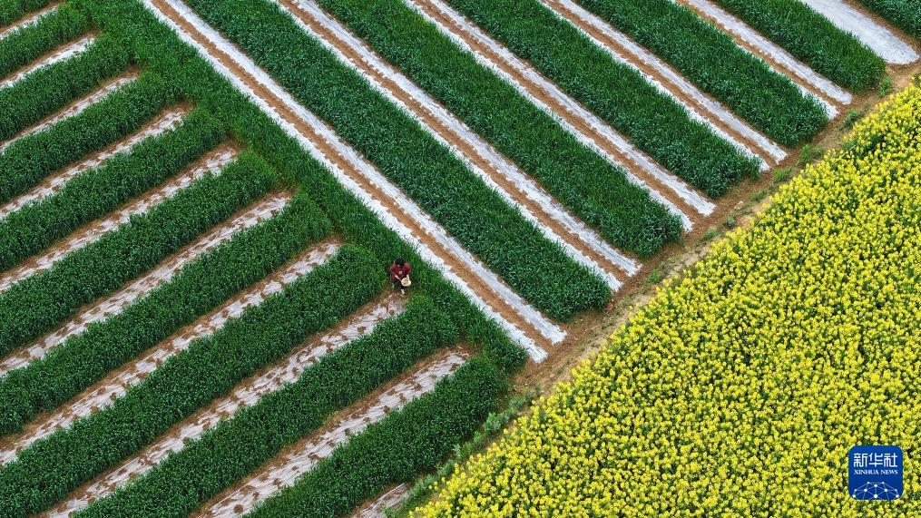 3月17日,在四川省阆中市白溪村,村民在给麦田里套栽的玉米苗施肥(无人机照片)。(新华社发 王玉贵 摄)